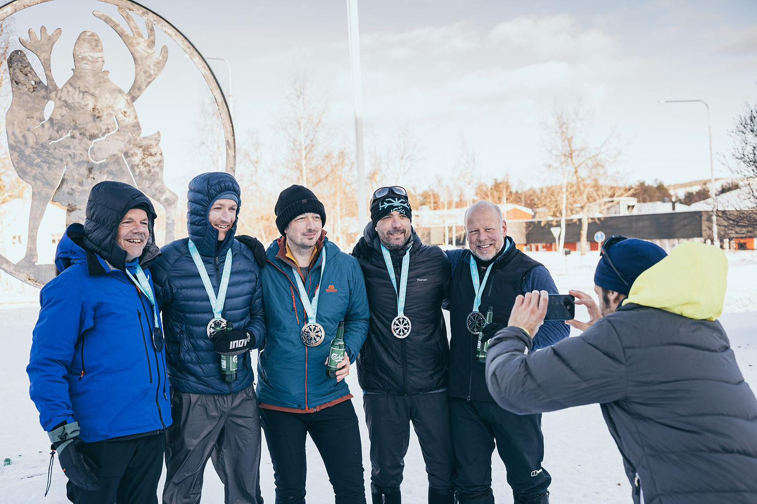 If Alex, George and James have cut the course. That puts Daryl first and me 2 second for the stage. I push on hard but there is no catching Daryl. As the course nears the finish we start running on a road. I quickly take off my snowshoes and set off, it feels like flying, after 230km the feeling of trainers on a hard surface is sheer joy. I hear some music in the distance and turn on to the red carpet to cheers and claps. FINALLY an actual finish line, THE finish line. I had completed the Ice Ultra 2024 and as Kris hung a medal round my neck and handed me a beer I received a final finish line hug from Jenny. 230km in some of the most gruelling conditions was over. I was drenched in sweat, my waterproof a layer too much for the days conditions and pace. Still being mindful of the cold I quickly changed into dry and warm kit before tucking into a finish line burger. JJ still wasn’t across the line. Maybe 27 minutes was possible?