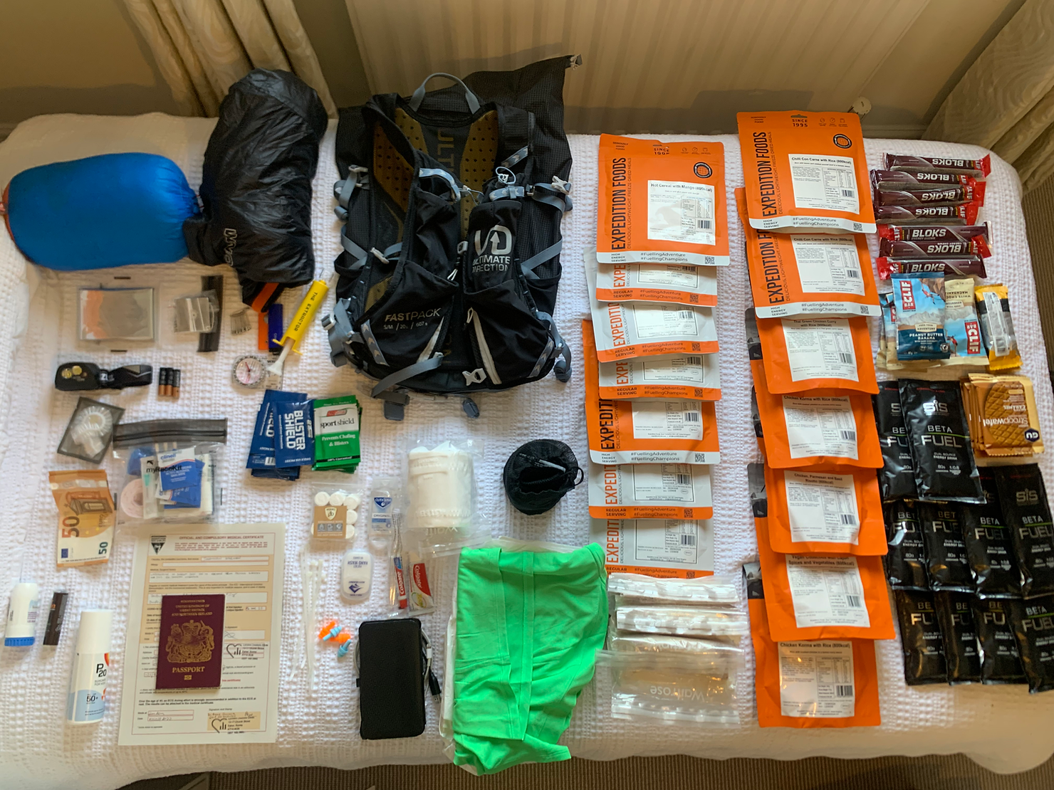 I found loads of great blogs on the subject but found I always wanted more opinions so decided to write this to help. A few of the blogs I read really stressed me out, they made believe my pack should weigh not a gram more than the 6kg minimum. When I realised that they were written by a 55kg elite female runner I realised that at 6’2” 75kg with an allergy to down I would need to be realistic about my pack weight. My pack weighed in at 8.1kg without water, I was happy with this.